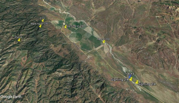 So after making the "Roscoe run" for about a week, new sighting reports had dwindled. I had figured that Roscoe had sought some place of refuge out of immediate view of people, plus it had been a three day holiday weekend and quiet in the valley. Then on Tuesday, February 13, I made an afternoon "Roscoe run" and searched a few new areas. Running low on gas, I headed home contemplating about placing the trail camera at a new location.